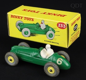 Cooper Bristol by Dinky Toys, No. 233. Near mint/boxed. Rare version with PRIMROSE YELLOW plastic wheels. A First for QDT! From The Cologne Collection. Starting bid £250. Please note that QDT apply 12.5% buyer's commission.