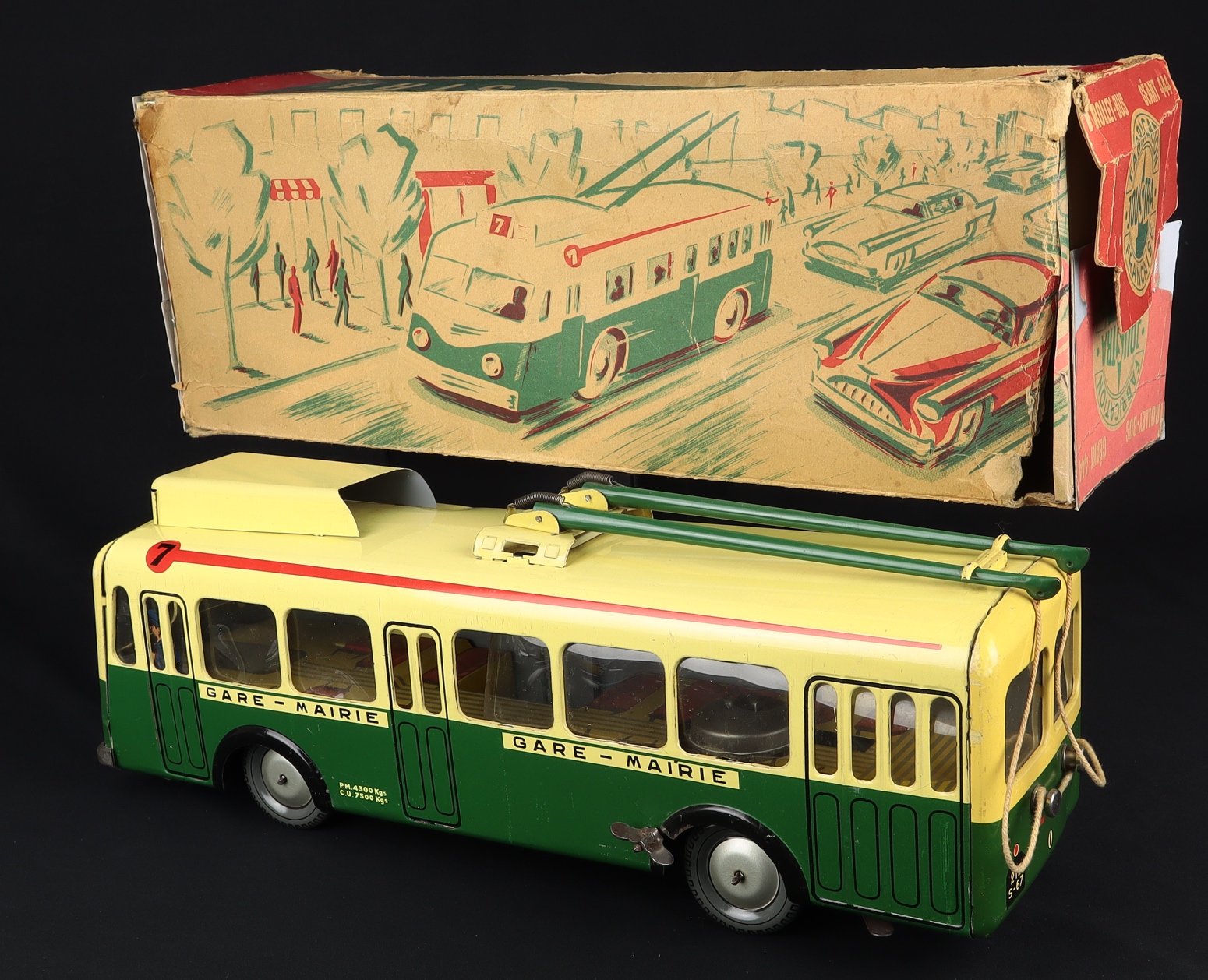 Trolley-Bus by Joustra Géant Models, No. 444. Large tinplate clockwork & battery-operated Trolley Bus. Working Motor. Unchecked battery function for headlights. Near mint plus/boxed. Scarce. From The West Sussex Collection. Starting bid £200. Please note that QDT apply 12.5% buyer's commission.