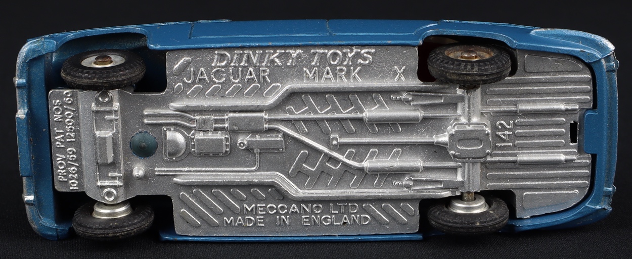 Jaguar Mark X by Dinky Toys, No. 142. MID-metallic blue, with SILVER BASE. Very scarce. Near mint plus/boxed. With luggage. From The Reference Collection.