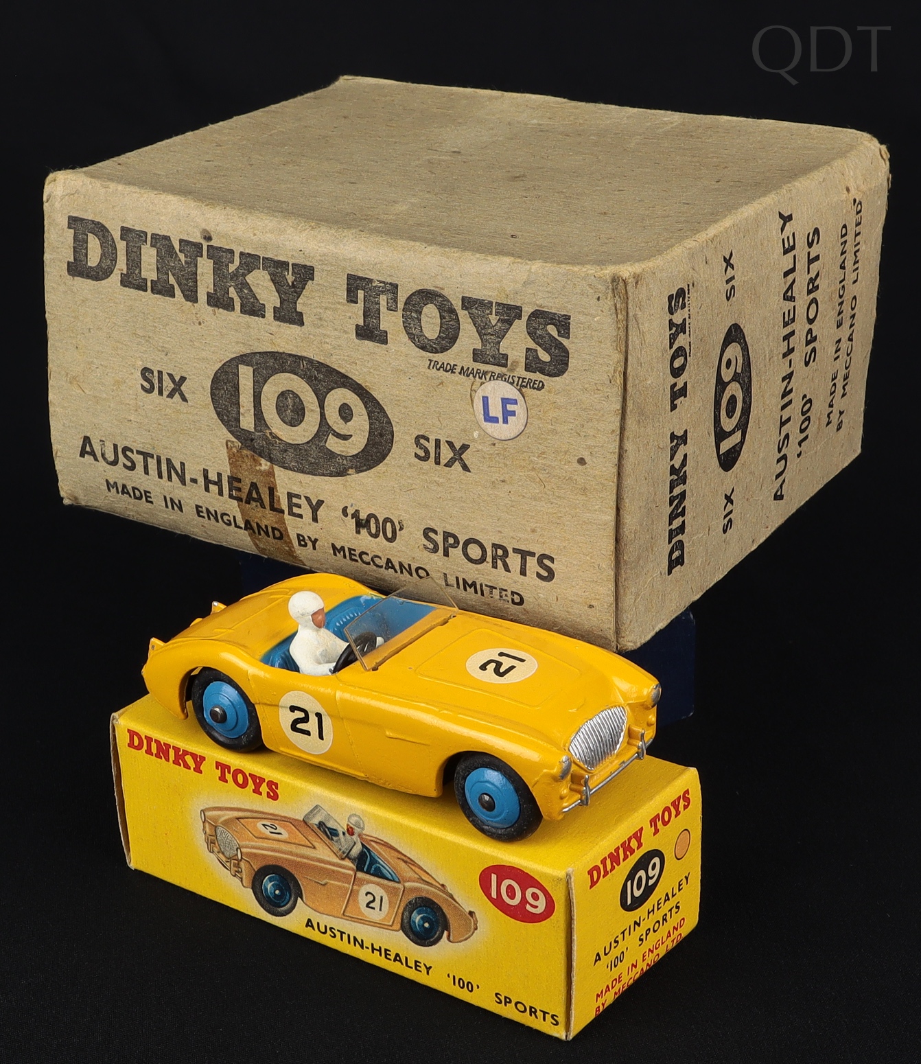 Austin-Healey '100' Sports by Dinky Toys, No. 109. Orange-yellow version. In original Dinky Shopkeeper's Trade Box. Dated 1957. Very near mint/boxed. From The Reference Collection.