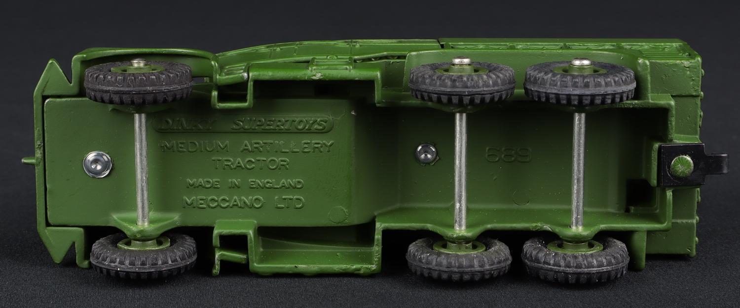 Medium Artillery Tractor by Dinky Supertoys, No. 689. Very near mint/boxed. Rare PLASTIC WHEELS issue. Complete with PLASTIC DRIVER & both spare tyres still stowed. From The Reference Collection.