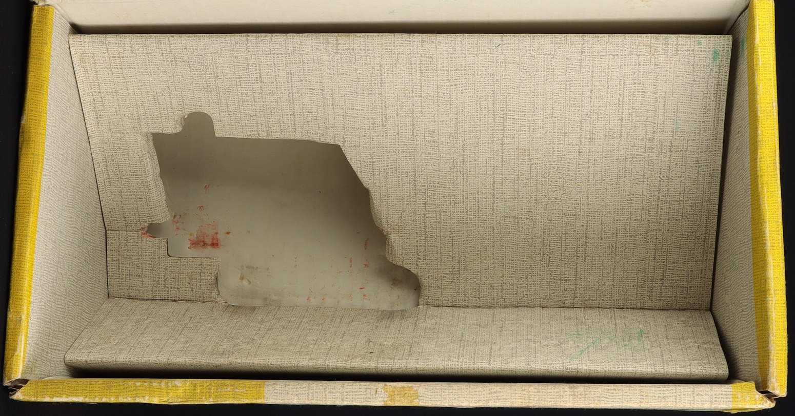 The distinctive sturdy card Dinky Supertoys box is complete and brightly-coloured. A little age/handling wear and a few scuffs/tiny tears. Residue from the old tape which kept the lid closed.