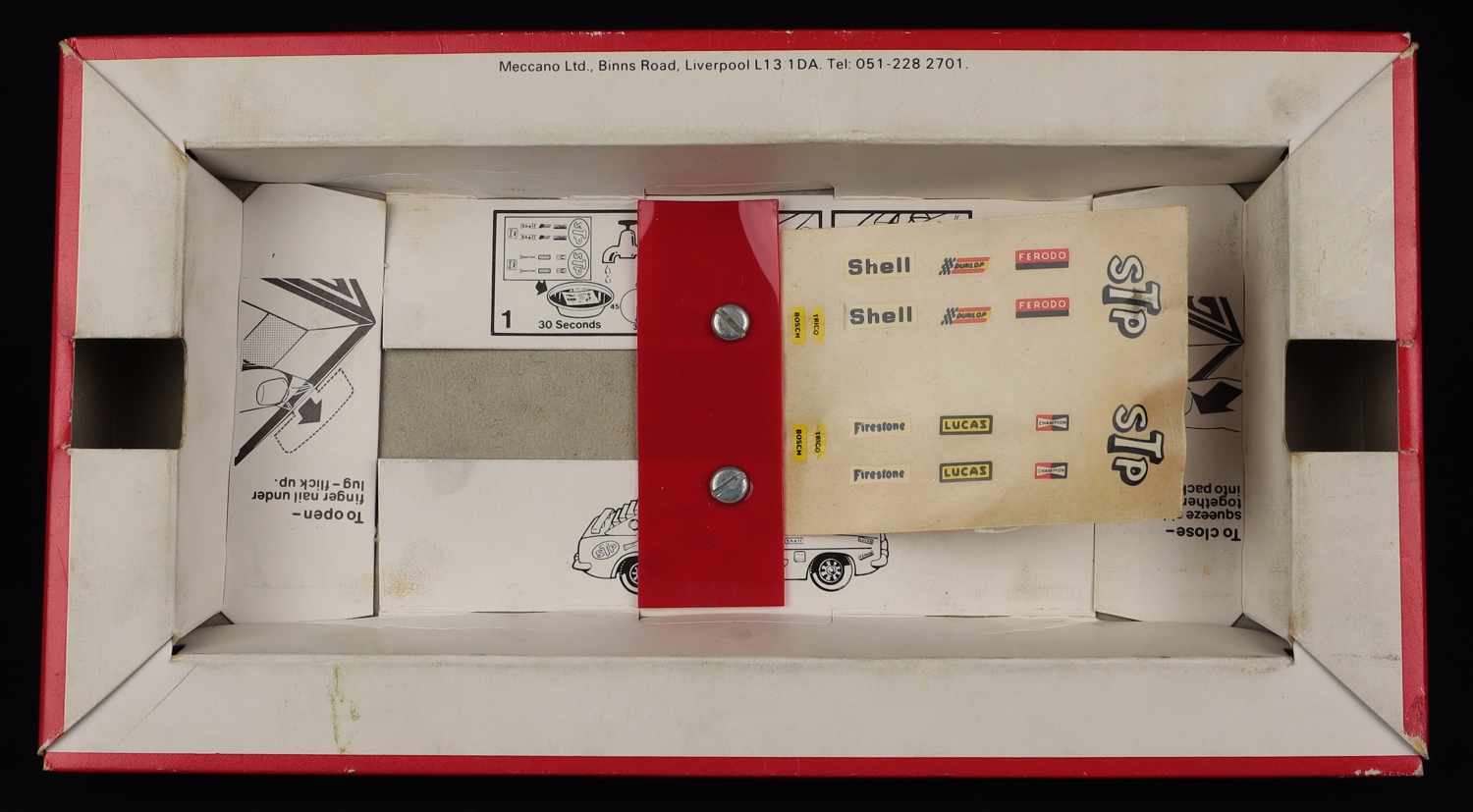 Issued 1974-76. A fantastic example of this larger scale Ford Capri Rally Special finished in gloss red and matte black with complete bright labels throughout. Brilliant unrubbed chrome too. This 1:25 scale model is still affixed to its distinctive red and gold card plinth. With transfer sheet.