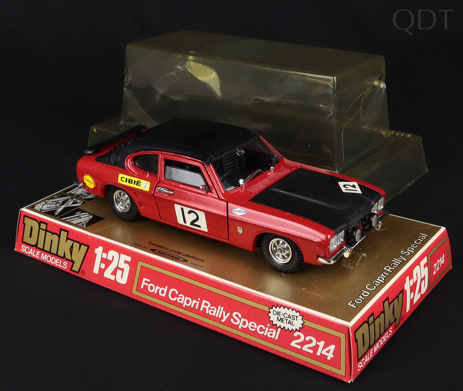 Ford Capri Rally by Dinky Toys, No. 2214. Very, very near mint/boxed, with Transfer Sheet. Model still fixed to the card plinth. Scarce. One owner from new.