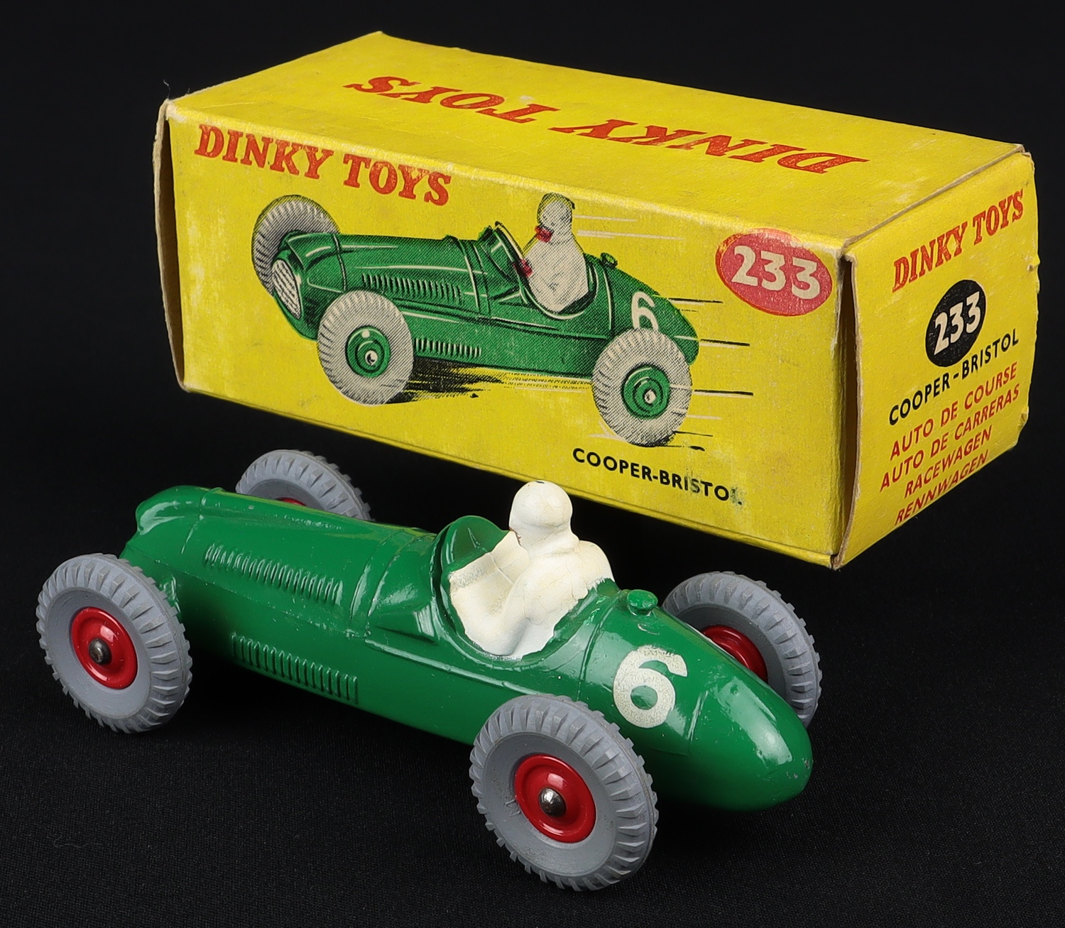 Cooper Bristol Racing Car by Dinky Toys, No. 233. Near mint plus/boxed. Scarce version with red plastic wheels. REVERSED Base. From The Cologne Collection.