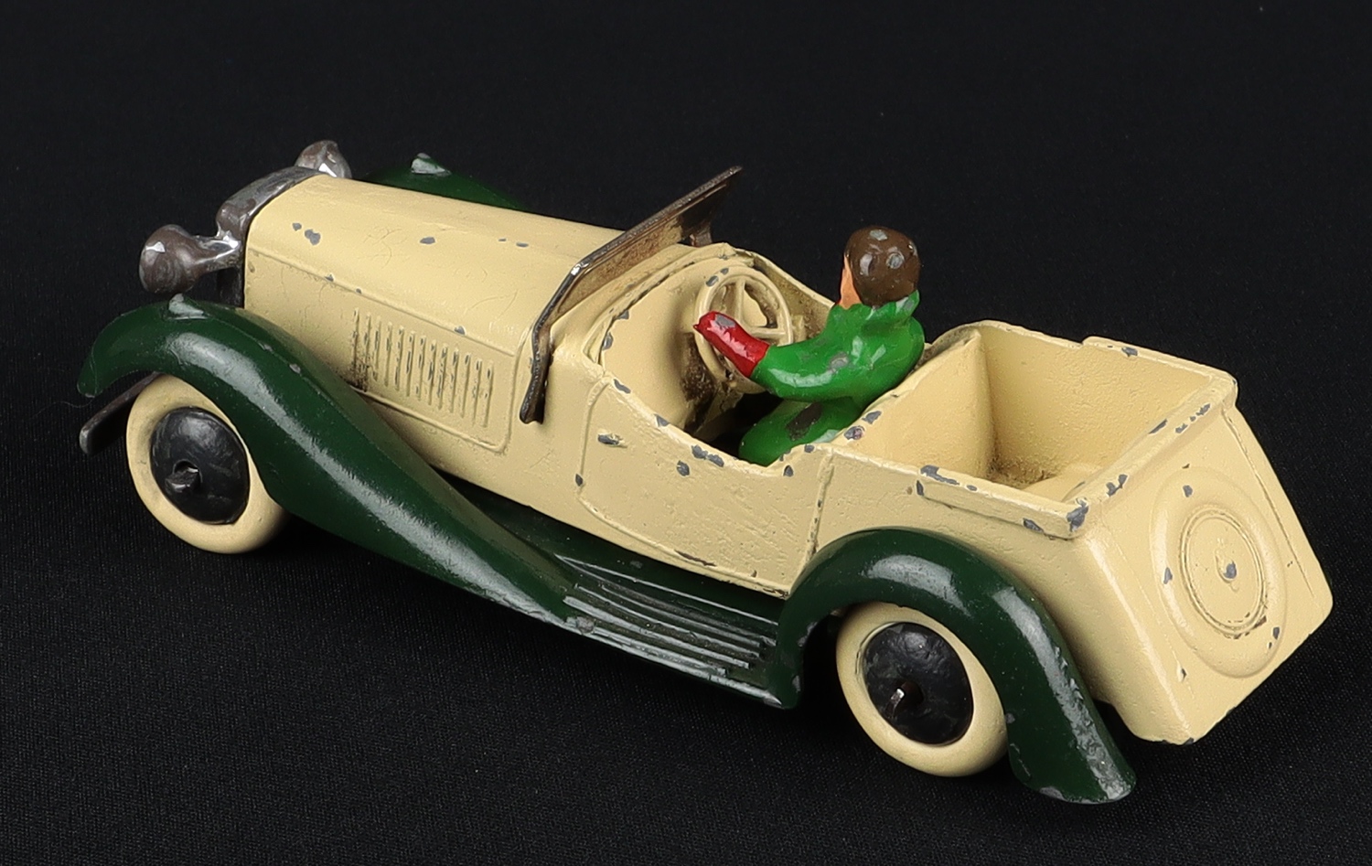 This four-seater sports car has a cream and deep green finish with smooth black ridged wheels and tinplate windscreen (tiny tarnishing).
