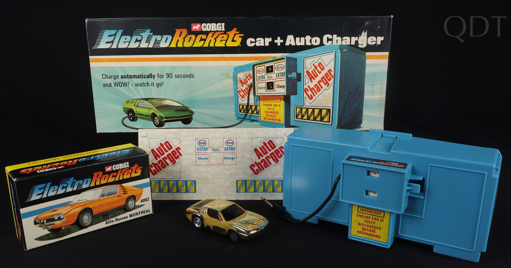 Car & Auto Charger by Corgi Electro Rockets 4002. Contains Alfa-Romeo Montreal. Unused set with all accessories. Car has reacted to packing so Excellent plus/boxed, with Packing, Instructions and unapplied labels. From The Wesley Lodge Collection. Starting bid £100. Please note that QDT apply 12.5% buyer's commission.