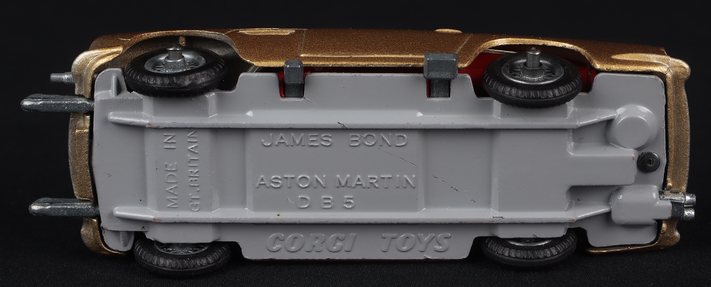 James Bond's Aston Martin D.B.5 by Corgi Toys, No. 261. Bright gold issue. Near mint plus/boxed. 1st issue WITH INDICATOR LIGHT CASTING. 1st issue style plinth & box with FULL Instruction Packet. With one owner from new! With personal recollection from the owner.