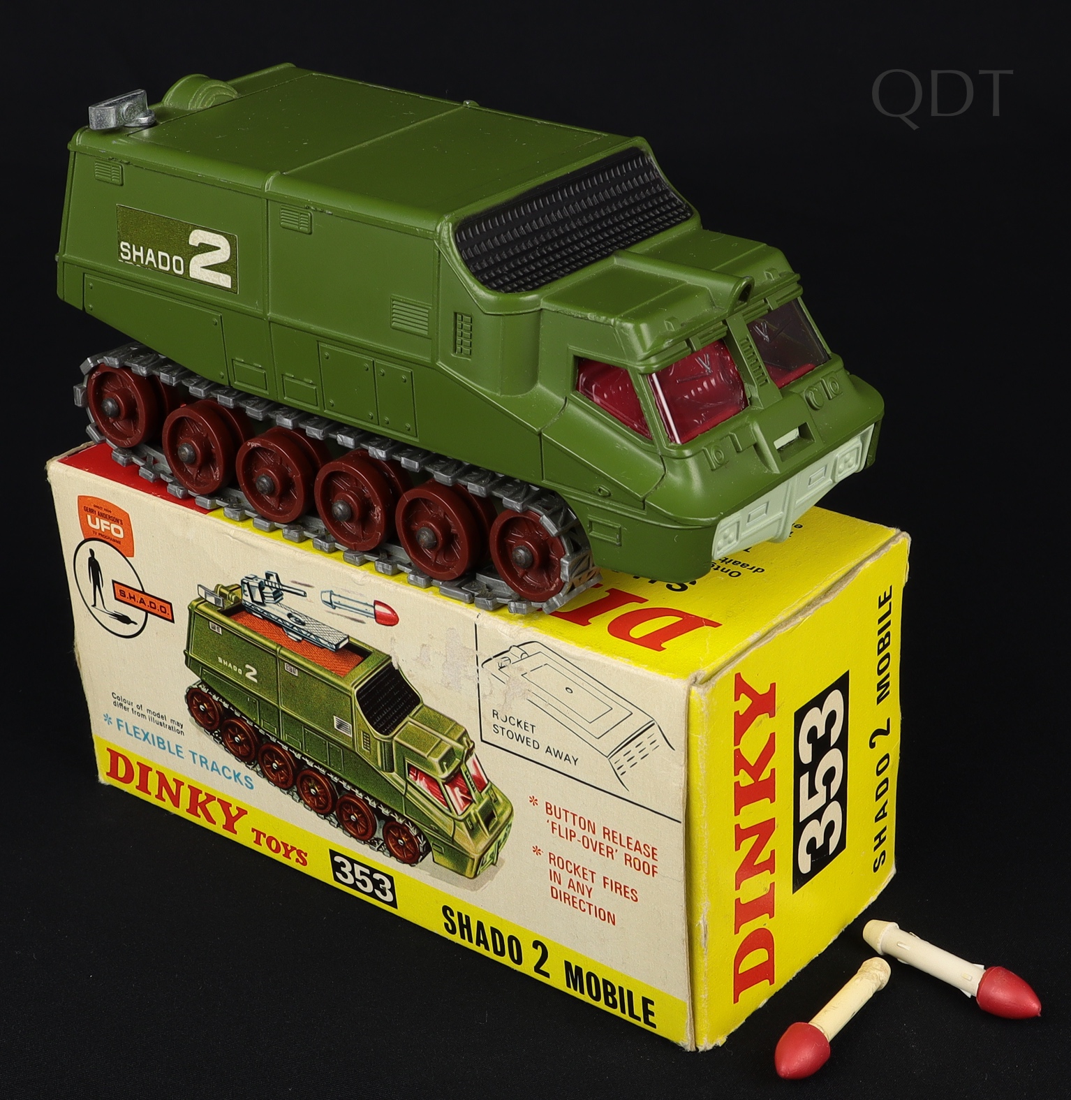 SHADO 2 Mobile by Dinky Toys, No. 353. SMOOTH ROOF, RED interior, brown rollers. Very scarce. Very near mint/boxed. 1st issue in pictorial card box. Complete with Instruction Leaflet, spare missile and inner packing card. From The Marc Mulvale Collection. QDT starting bid £250. Please note that QDT apply 12.5% buyer's commission.