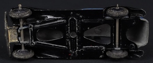 This luxurious car has a distinctive lavender blue and black finish, intact radiator and headlight assembly. Complete radiator emblem. Smooth black wheels (light crazing to one). 3rd type chassis. Original fine tread black tyres.