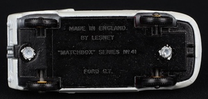 Ford GT by Matchbox Models, No. 41 White with blue bonnet stripe, YELLOW PLASTIC wheels and BLACK BASE. Very near mint/boxed. From The Marc Mulvale Collection. Starting bid £75. Please note that QDT apply 12.5% buyer's commission.