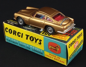 The outer box is the 1st issue style – correct without the shading detail around the lettering ASTON MARTIN DB5 on the box face and no thick black border around the JAMES BOND’S lettering, either. Strongly-coloured and looking crisp and fresh. Very light wear only.