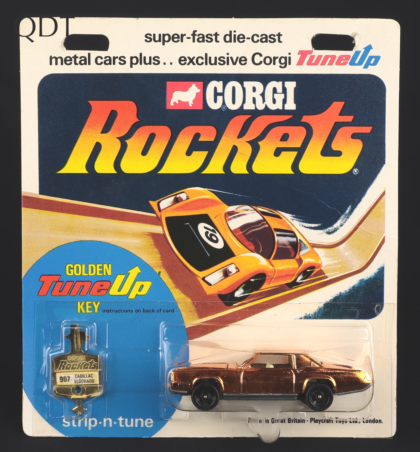 Cadillac Eldorado by Corgi Rockets, No. 907. Mint/boxed. LIGHTER PLATED COPPER issue. Sealed blister with TEARDROP shaped lower section. Scarce. From The Wesley Lodge Collection. QDT starting bid £100. Please note that QDT apply 12.5% buyer's commission.