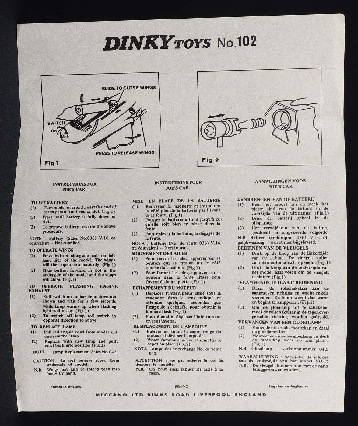 Joe's Car (Gerry Anderson's Joe 90) by Dinky Toys, No. 102. Very near mint/boxed. In pictorial card box. With Instruction Leaflet & all packing. From The Marc Mulvale Collection. QDT starting bid £250. Please note that QDT apply 12.5% buyer's commission.