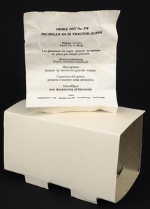 A remarkable find! This Michigan Tractor Dozer has an authentic (somewhat chipped) light yellow finish on this Dinky model which comes complete with both removable engine covers (also uniquely finished in lemon). Note too that the blade is all yellow. Unique feature that this item has pale yellow hydraulics and a lemon seat! Blue plastic wheels (as pictured on the box). ‘Michigan’ lettering on both sides.