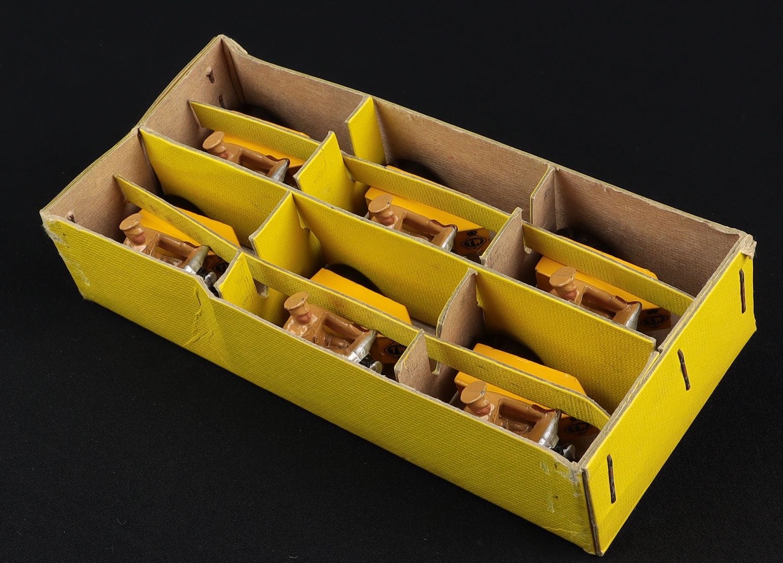 Bright yellow sturdy lift-off lid Dinky Trade Box is complete and intact – and notably all dividers are present.
