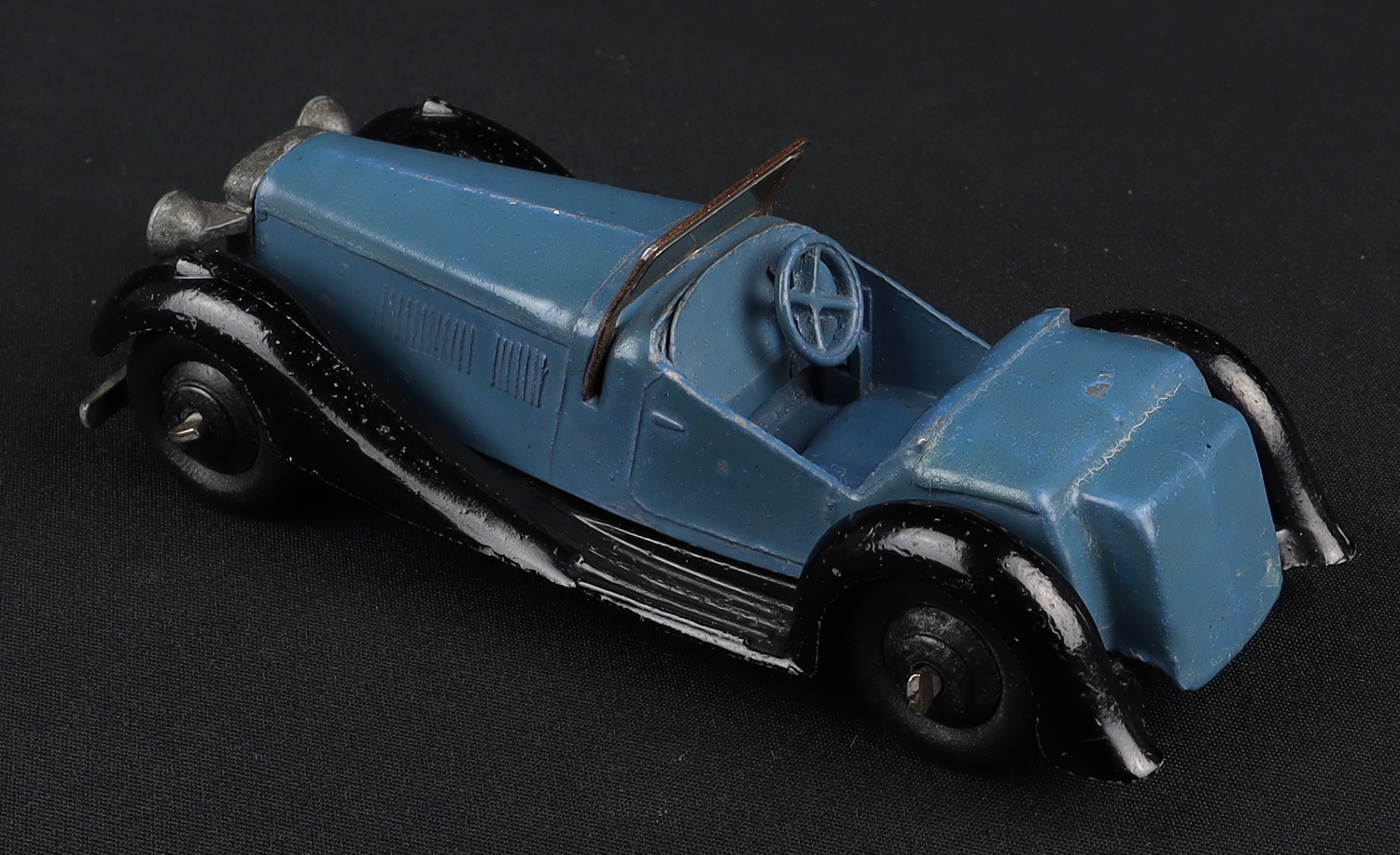 British Salmson Two-Seater Sports Car by Dinky Toys, No. 36E. Saxe blue/black. Ridged wheels. Near mint plus/never individually boxed. Scarce! From The Cologne Collection. QDT starting bid £50. Please note that QDT apply 12.5% buyer's commission.