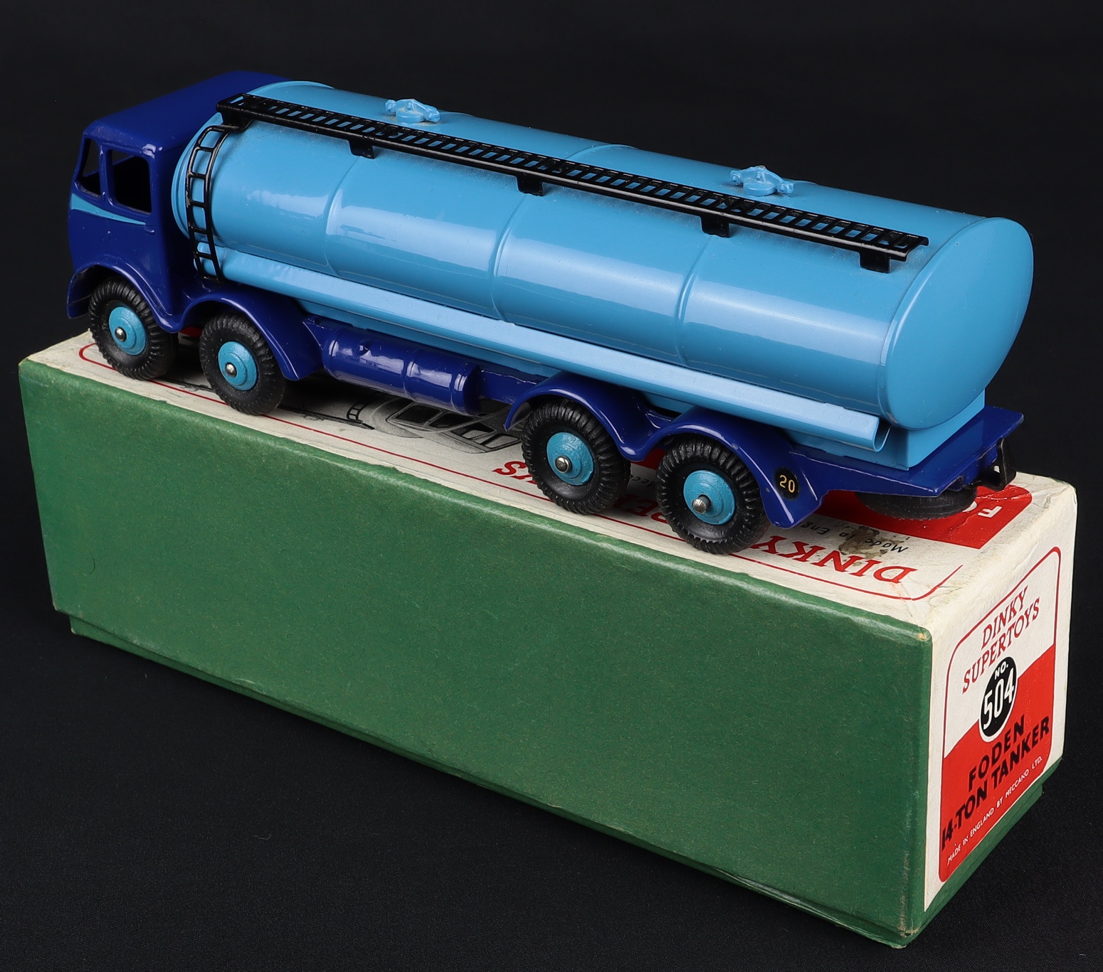 Foden 14-Ton Tanker by Dinky Toys, No. 504. Two-tone blue.1st Type. Near mint plus/boxed. In GREEN lift off lidded card box. Starting bid £250. Please note that QDT apply 12.5% buyer's commission.