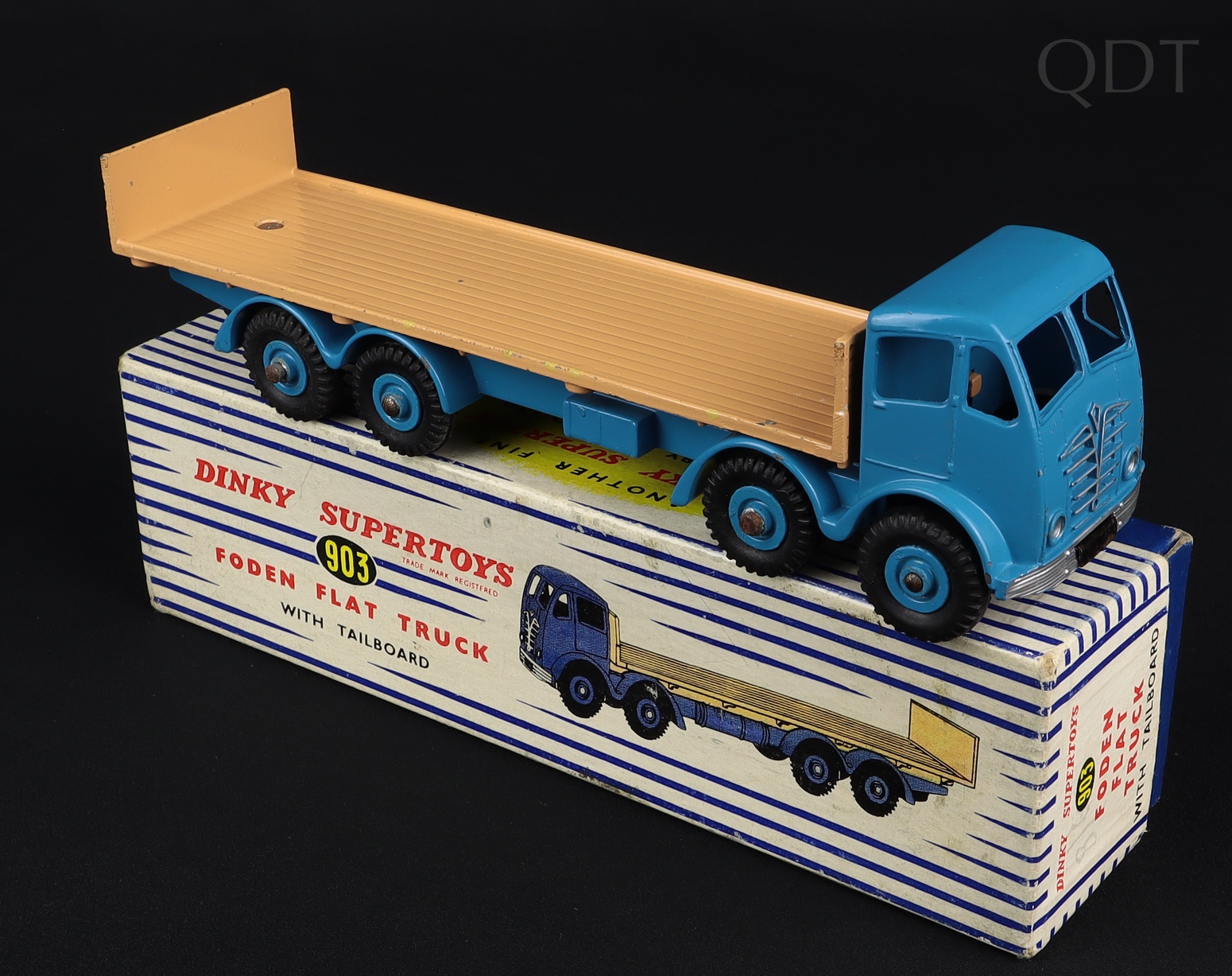 Foden Flat Truck with Tailboard by Dinky Toys, No. 903. Near mint /boxed. Very scarce pale blue & fawn issue with bolt fixing (1957). CORRECT BOX. Starting bid £300. Please note that QDT apply 12.5% buyer's commission.