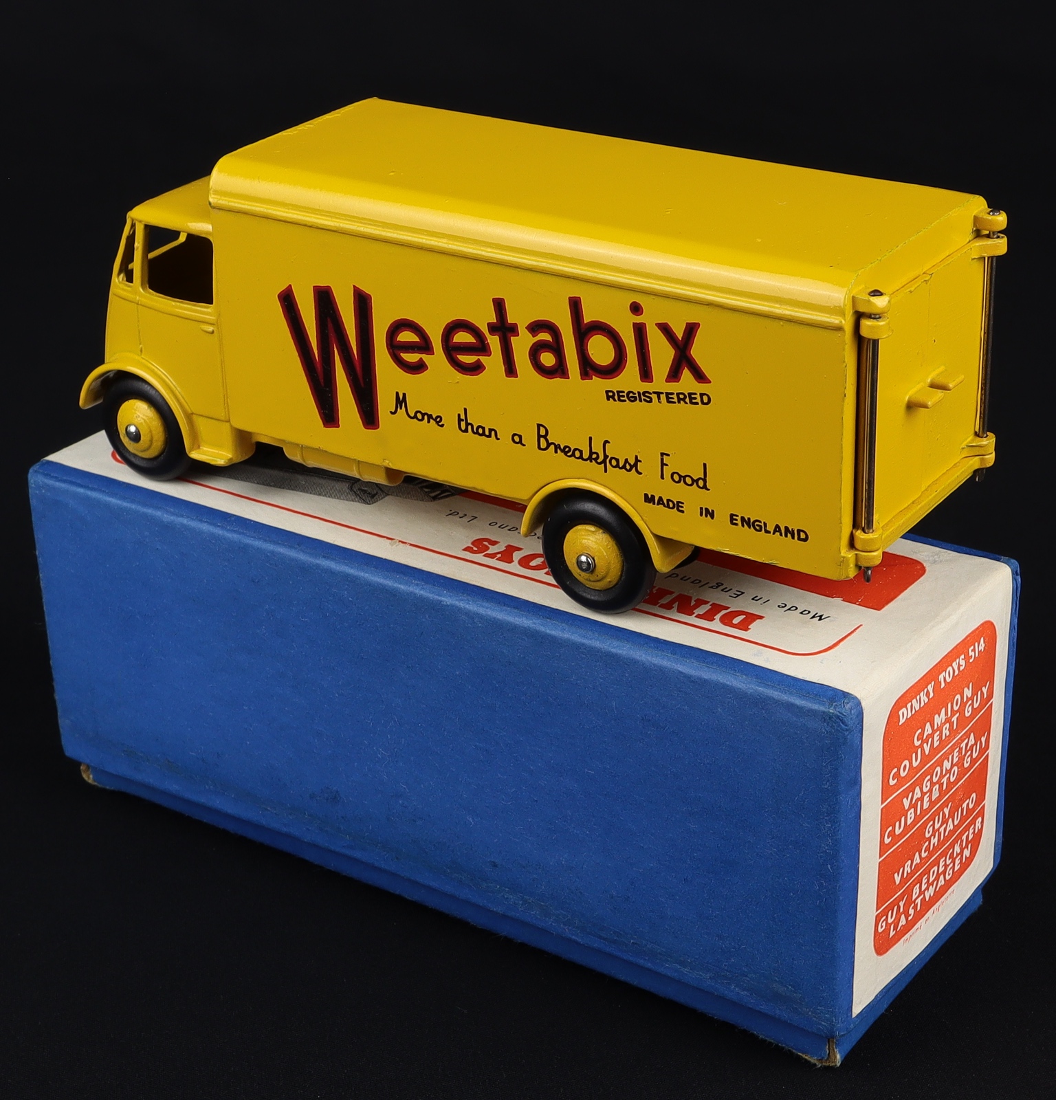 Guy Van "Weetabix" by Dinky Toys, No. 514. Very, very near mint/boxed. With early CAST wheels. Remarkably fresh box. Scarce high profile Dinky commercial from The Denis Tyler Collection. QDT starting bid £1000. Please note that QDT apply 12.5% buyer's commission.