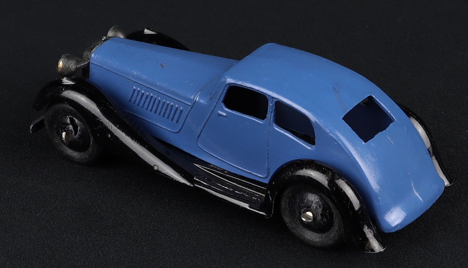 This classic Rover model has an appealing shining saxe blue and black finish. Smooth black wheels and smooth black tyres. Detailed cast chassis is shiny. Intact and complete radiator, headlight and bumper assembly.