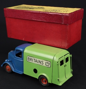 Surely every Britains collector should have one! This delightful Van is finished in mid blue and green with virtually complete ‘BRITAINS LTD’ transfers on both sides Silver trim. Ochre red wheels and well-shaped original treaded tyres. Opening doors. Working clockwork motor.