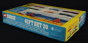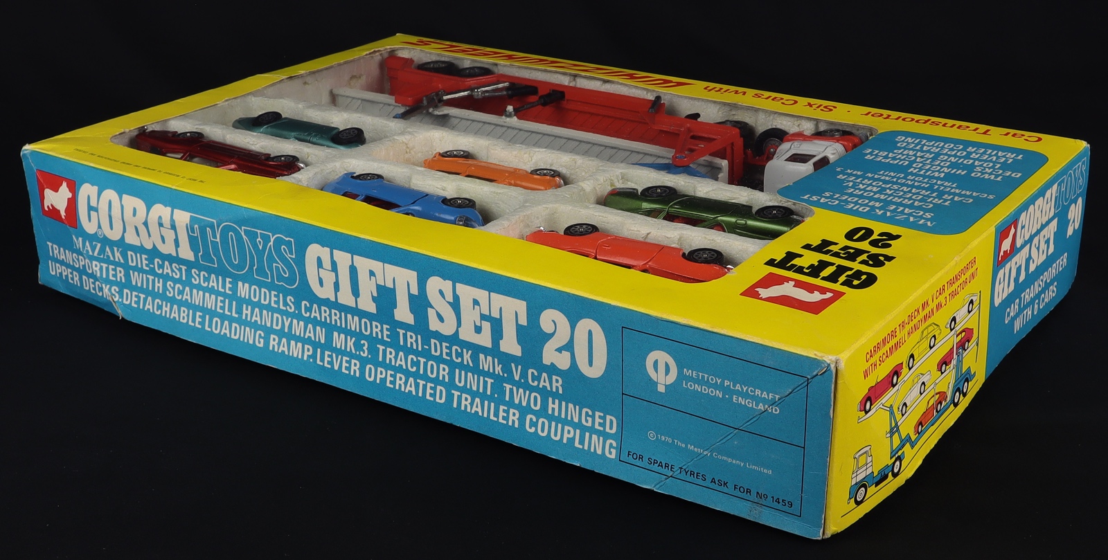Scammell Car Transporter with 6 Cars by Corgi Toys, Gift Set No. 20. Excellent plus - very near mint/boxed (repair), with Operating Instruction Leaflet & Traffic Cones. From The Gower Collection. A very rare set which includes Corgi 305 Mini Marcos in blue. QDT starting bid £500. Please note that QDT apply 12.5% buyer's commission.