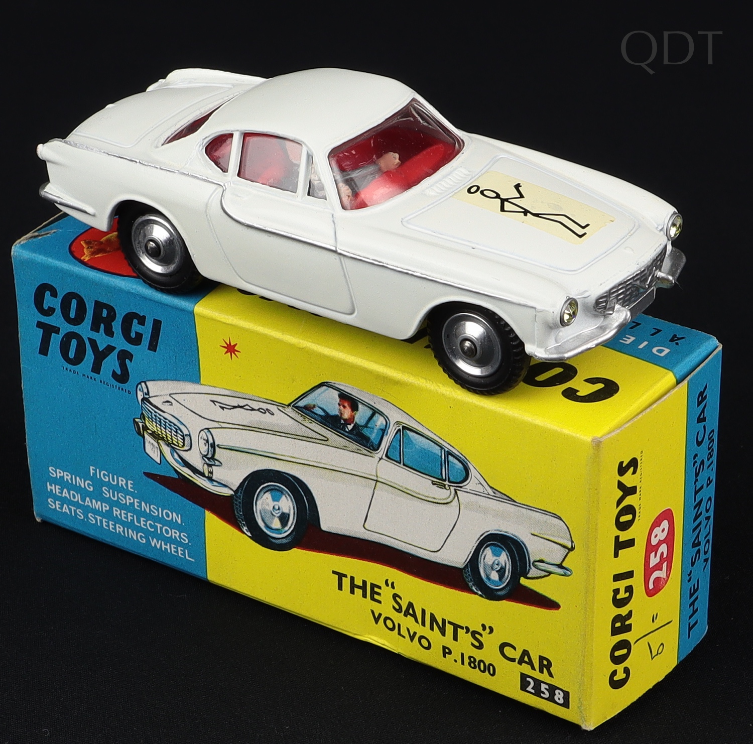 The "Saint's" Car Volvo P.1800 by Corgi Toys, No. 258. Very, very near mint/boxed. First issue with a black Saint logo figure on a cream background. From The Ian Hewlett Collection.