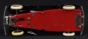 Post-war version of the Town Coupe finished in flame red and black with shiny metal parts throughout. Red wooden seats. Working clockwork motor. Smooth, well-shaped white tyres.