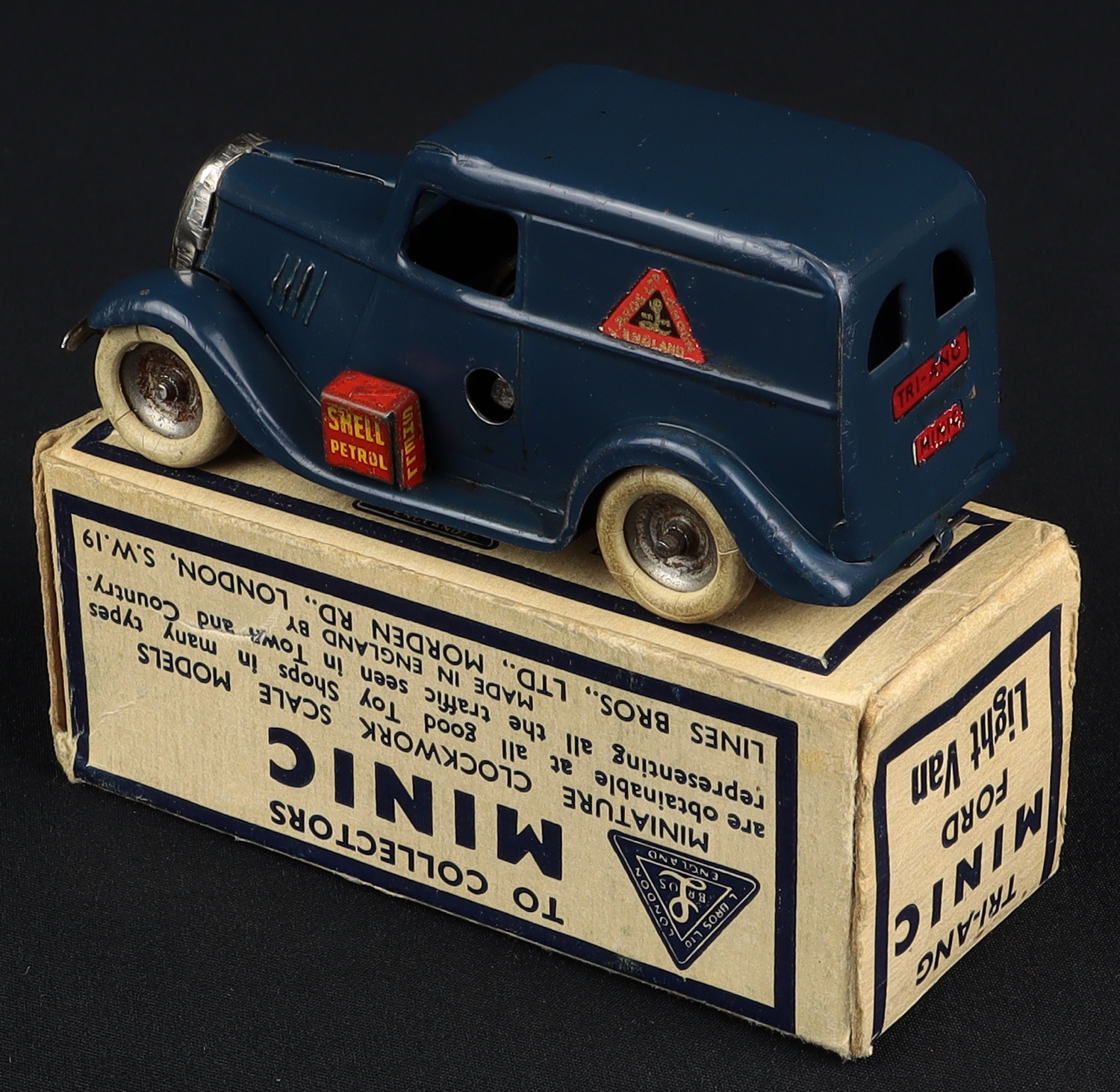 Ford Light Van by Minic Models, No. 2M. Working clockwork motor with key. PRE-WAR version in DARK BLUE. Near mint plus/boxed. From The Denis Tyler Collection. Starting bid £100. Please note that QDT apply 12.5% buyer's commission.