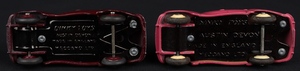 1) Rich maroon with maroon wheels, Silver trim and well-shaped smooth original tyres. Small baseplate print. Rear axle held by the baseplate. Very near mint.