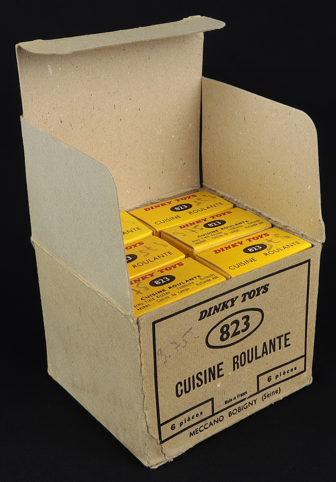 6 x Military Mobile Kitchens by French Dinky Toys, No. 823 in Dinky Trade Box. Assumed very, very near mint/boxed. Most individual boxes have never been opened! Super unsold old shop stock item from The Reference Collection of fine Dinky Toys. Starting bid £175. Please note that QDT apply 12.5% buyer's commission.