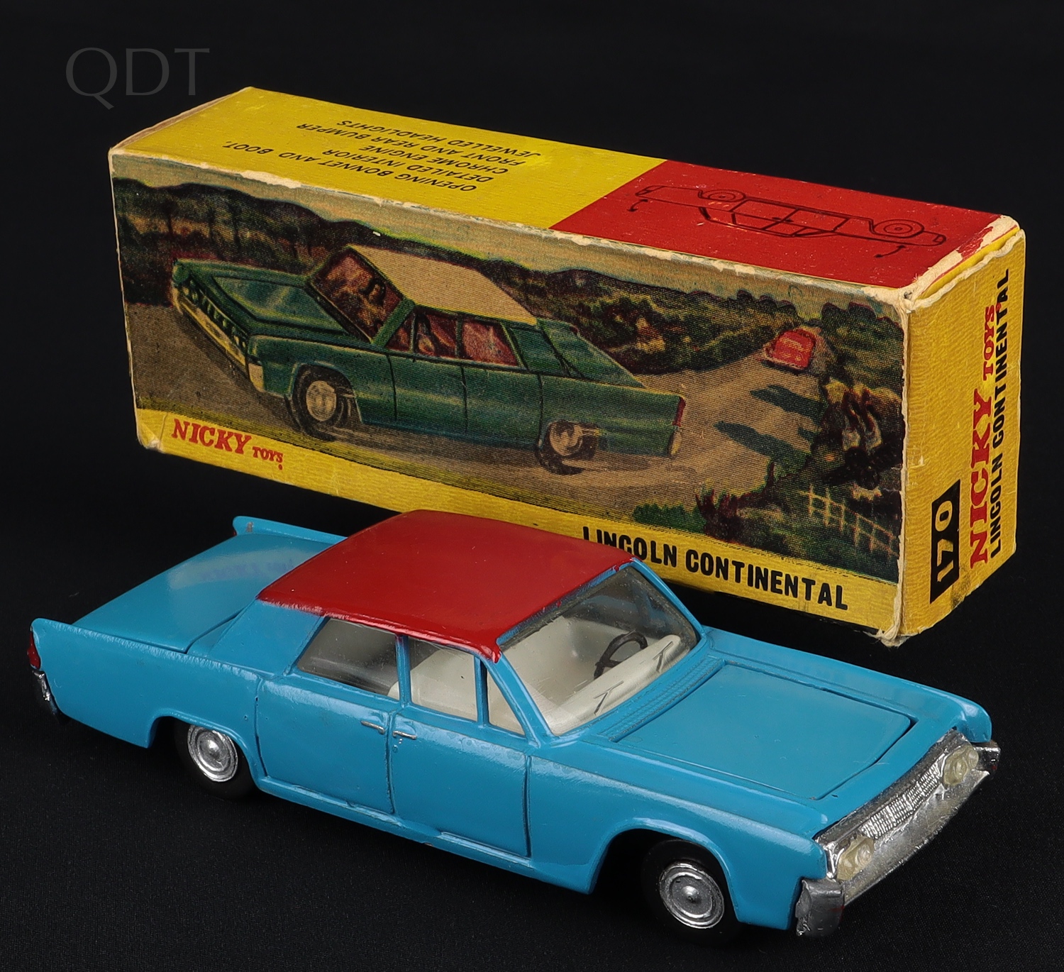 Lincoln Continental by Nicky Dinky Toys, No.170. Bright mid-blue with a RED roof. Scarce - and a First for QDT! Very near mint/boxed. From The Phenomenal Collection. Starting bid £200. Please note that QDT apply 12.5% buyer's commission.