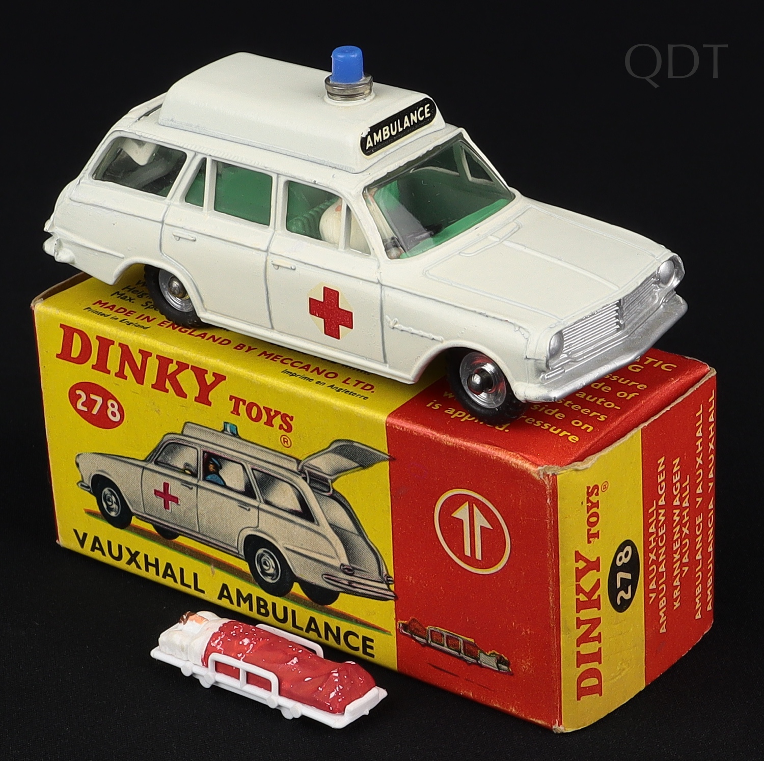 Vauxhall Victor Ambulance by Dinky Toys, No. 278. GLOSS white. Scarce. With patient on stretcher. Very near mint/boxed. From The Reference Collection.