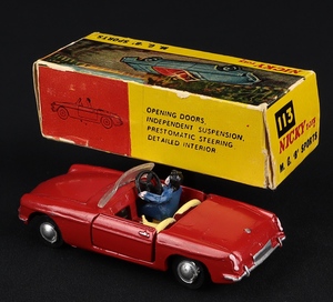 This Nicky Dinky MGB car is finished in a rich brick red with black seats, blue driver, intact steering wheel and windscreen. One-piece wheels and tyres.