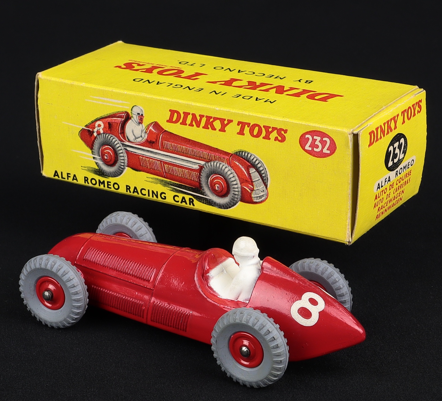 Alfa Romeo Racing Car by Dinky Toys, No. 232. Very, very near mint/boxed. Rare with RED PLASTIC WHEELS. Gloss base. From The esteemed Spa-Francorchamps Collection. QDT starting bid £250. Please note that QDT apply 12.5% buyer's commission.