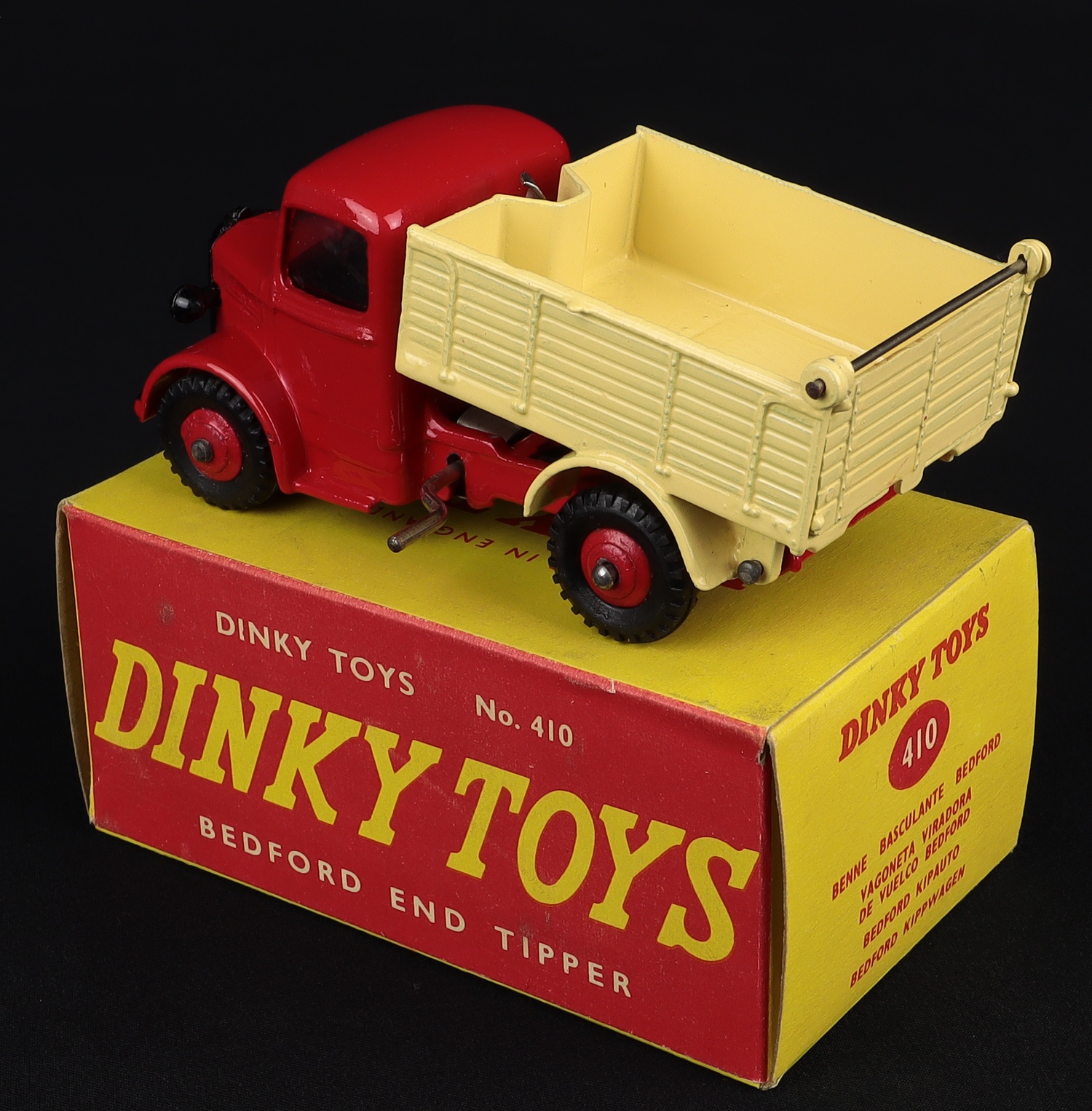 Bedford End Tipper by Dinky Toys, No 410. Very near mint/boxed. Red and cream issue, red cast wheels, window glazing. Transition issue. With card packing ring. Scarce model from The Reference Collection.