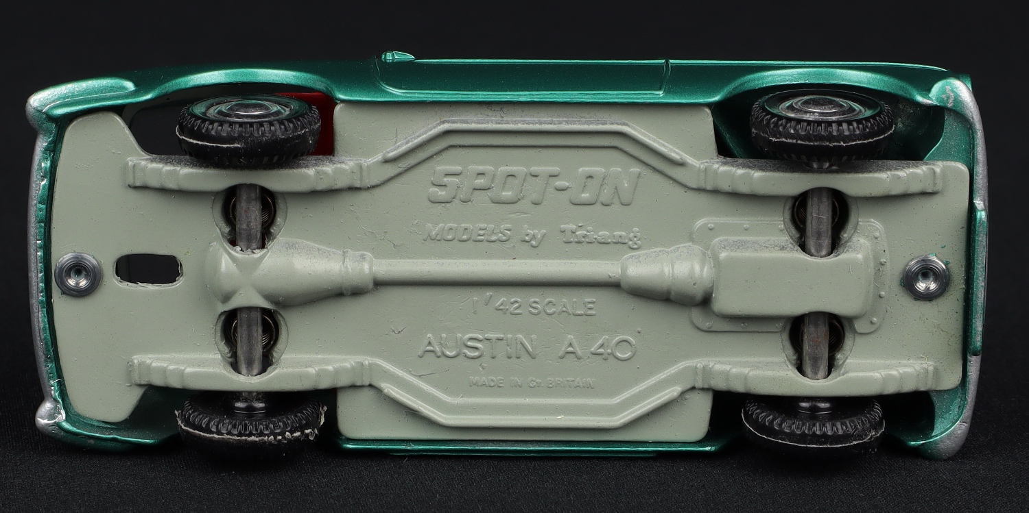 Austin A40 by Spot-on Models, No. 154. METALLIC GREEN & black, with RED interior. One-piece wheels and tyres. Scarce. Late issue. Very near mint/boxed., with Collector's Card. Starting bid £200. Please note that QDT apply 12.5% buyer's commission.