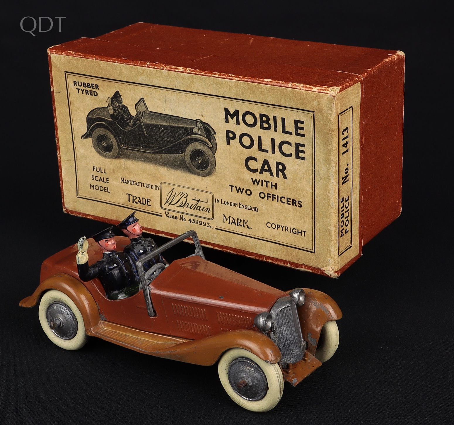 Mobile Police Car with 2 Officers by Britains Models, No. 1413. Near mint/boxed. Rare issue. Another First for QDT! From The Denis Tyler Collection. Starting bid £500. Please note that QDT apply 12.5% buyer's commission.