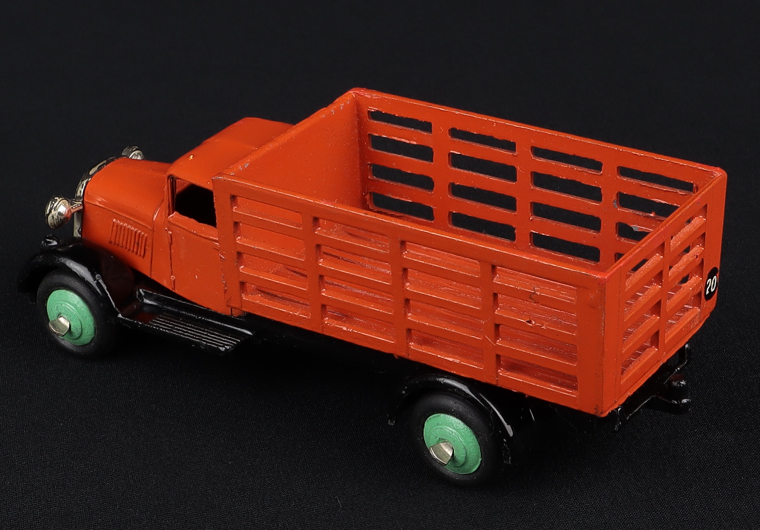 Issued between 1947-50, this is a scarce 25 series truck, fourth type, with an all original striking o*range and black finish, an especially difficult find with green wheels*, intact radiator and headlight assembly with an excellent quantity of chrome finish still remaining and 20 mph sign at rear wheel arch.