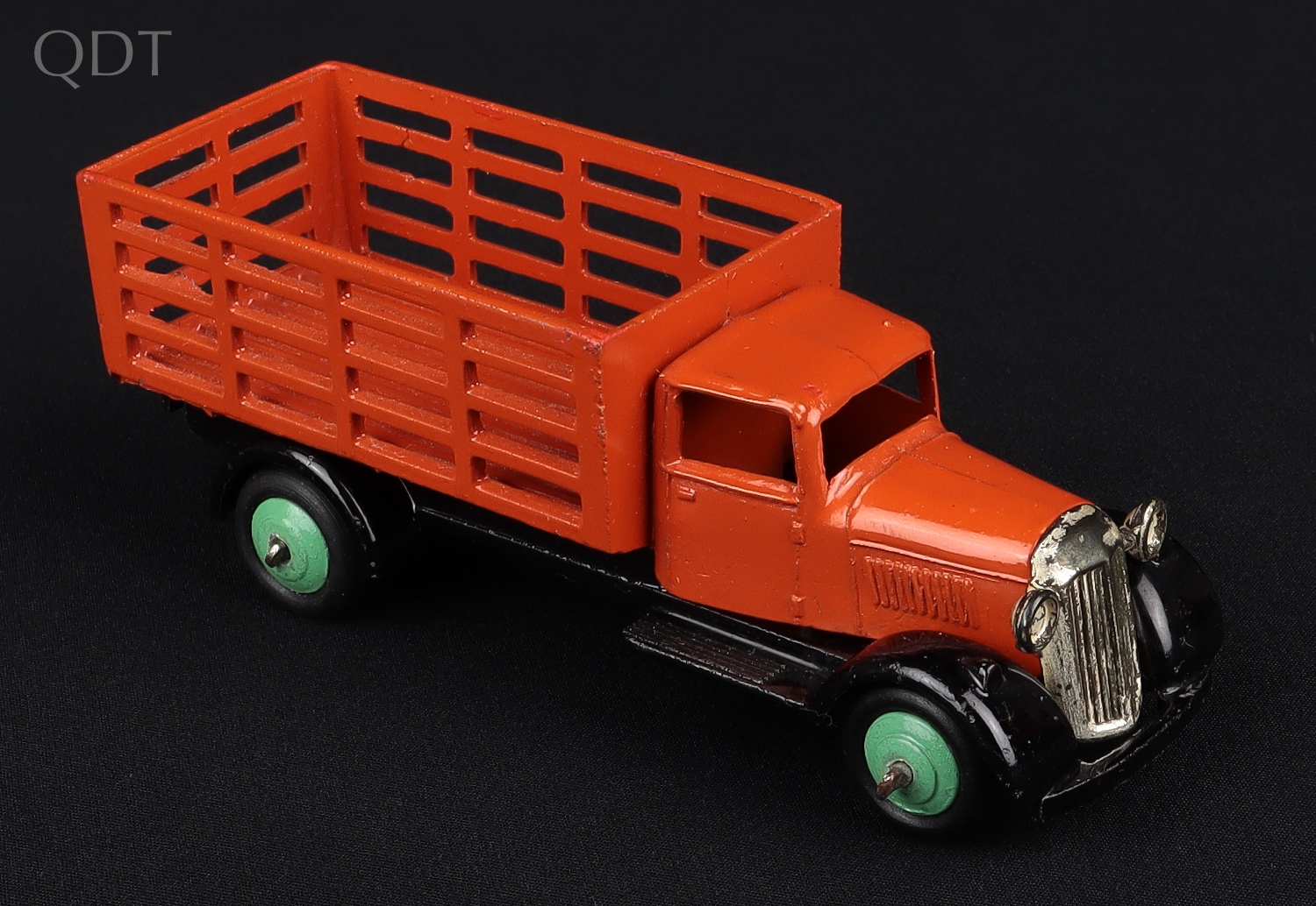 Market Gardeners Lorry by Dinky Toys, No.25F. Scarce find in ORANGE & BLACK, with GREEN wheels. Very near mint/never boxed individually. So scarce! From The Denis Tyler Collection. QDT starting bid £150. Please note that QDT apply 12.5% buyer's commission.