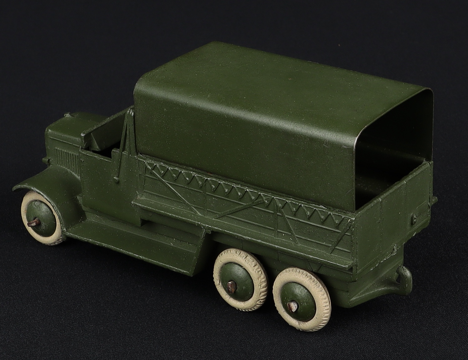 Six-Wheeled Covered Wagon by Dinky Toys, No. 151B. Matte military green with driver. Very near mint/never boxed individually. Scarce issue from 1946. SMOOTH wheels. From The Denis Tyler Collection. QDT starting bid £125. Please note that QDT apply 12.5% buyer's commission.
