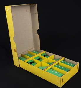 Bright yellow Dinky Trade Box is sturdy with no tears or repairs. Pencilled writing on one side of the lid has largely been erased. Light handling wear.
