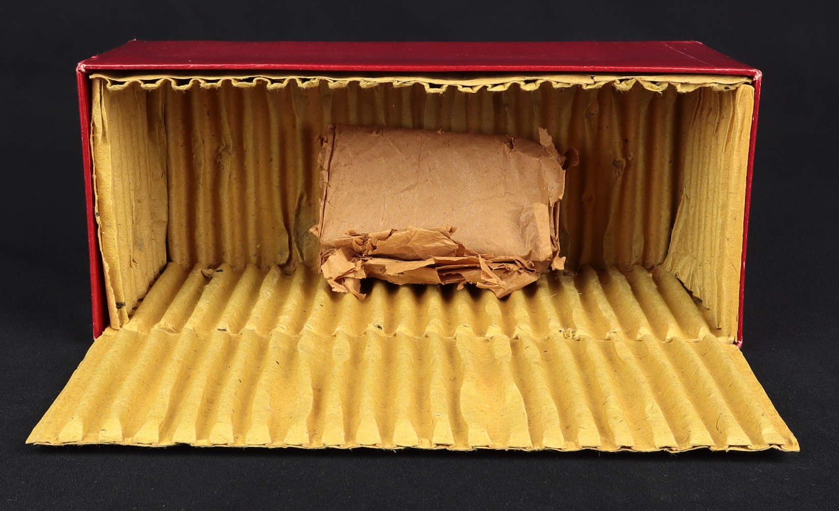 Sturdy red lift-off lid box has a complete illustrated paper label. Very light wear onky to this fine box.