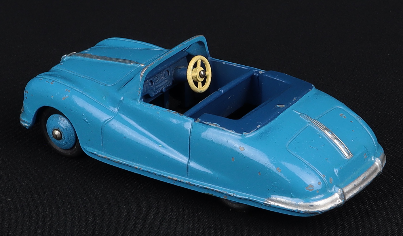 Austin Atlantic by Dinky Toys, No. 104A. Rare version in BRIGHT MID-BLUE with GLOSS DEEP BLUE SEATING, BLUE RIDGED WHEELS. Near mint/not individually boxed. From The 25 Year Collection in California. QDT starting bid £300. Please note that QDT apply 12.5% buyer's commission.