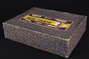 Delightfully patterned box lid is complete and in authentic state with no repairs. Note that one corner of the lid has a small seam tear. Rubbing at some edges as you may expect. Complete and strongly-coloured paper label features the ‘Dinky Toys boy’ alongside Dinky toy models.