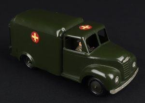 Sleek matte military green Ambulance (round-nosed) with large Red Cross labels. Rare 3rd version with split windscreen. Driver, Opening rear doors. A little wear to the transfers. Green plastic wheels. Well-shaped, as-new tyres with ‘BRITAINS LTD’ embossed. Late 1956 version.