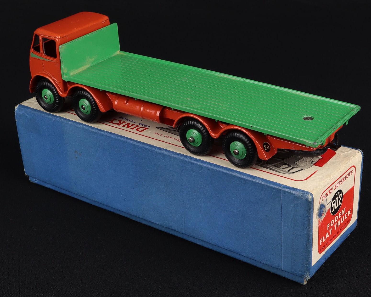 Foden Flat Truck by Dinky Toys, No. 502. Near mint plus/boxed. Scarce 1st issue in burnt orange and green. From The Denis Tyler Collection. Starting bid £300. Please note that QDT apply 12.5% buyer's commission.