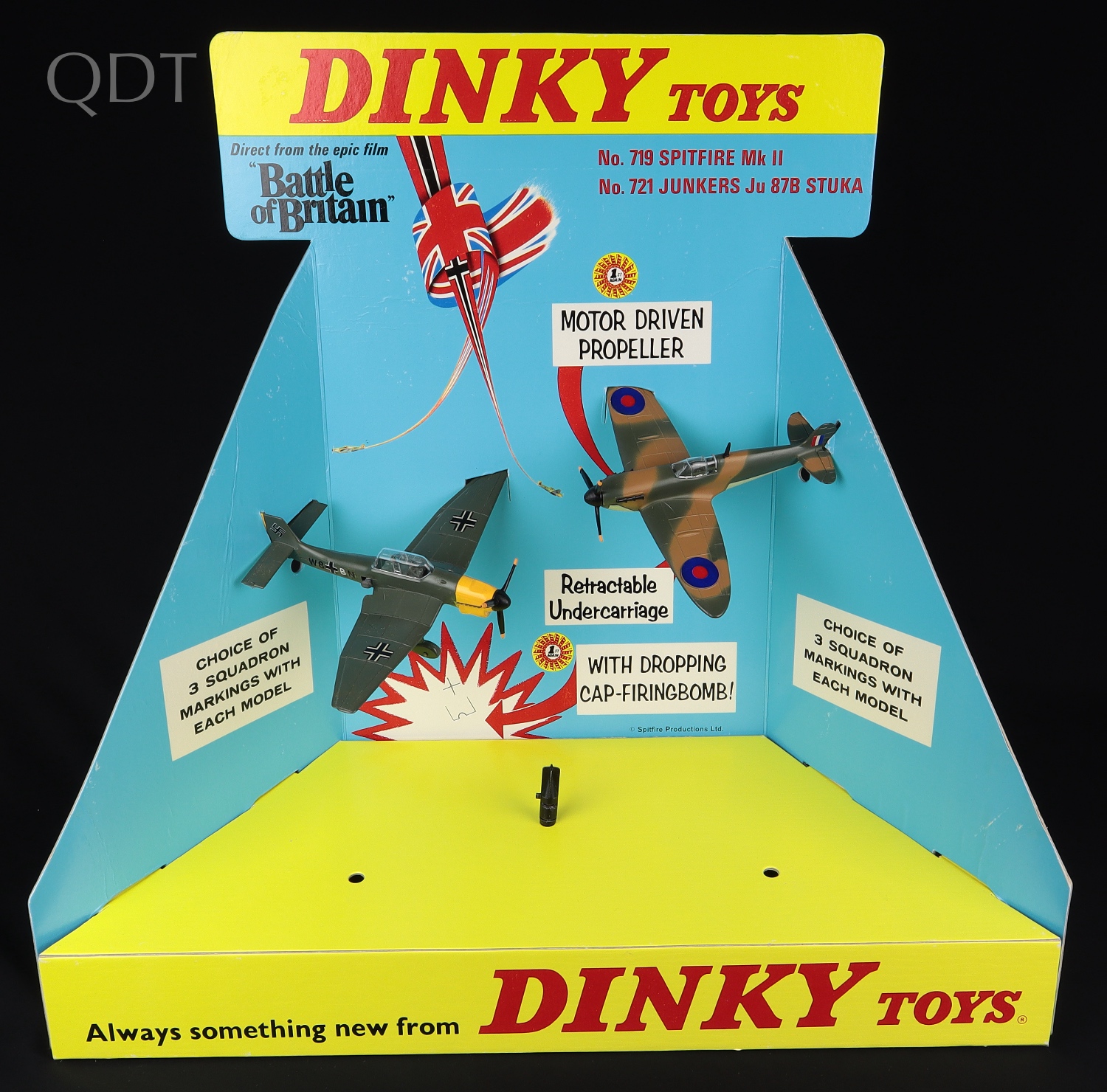 Dinky Battle Of Britain Display Stand with Dinky 719 Spitfire & 721 Junkers Stuka. Superb and scarce. Promotional shop display item. Sensational item from The Derby Collection. Starting bid £300. Please note that QDT apply 12.5% buyer's commission.