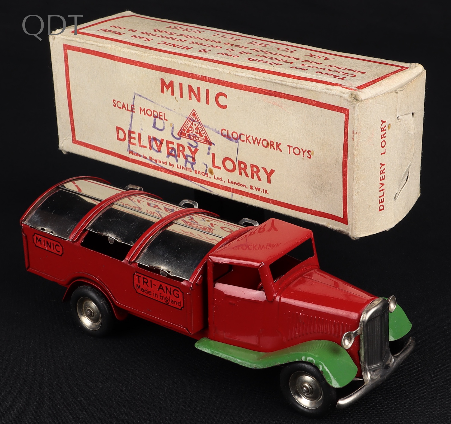 A very attractive tinplate refuse lorry from the respected model toy makers Minic. This is the early long bonnet version in vivid red and green.
